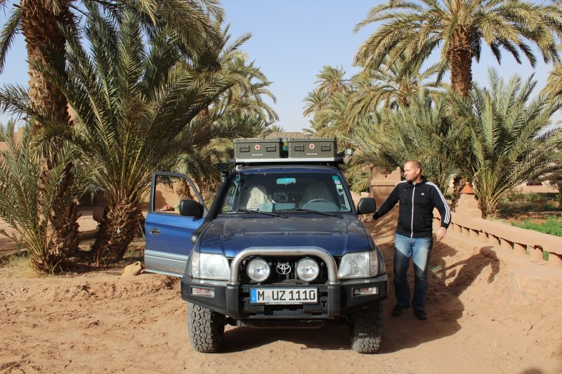 Gegen Mittag erreichen wir den Ort Mhamid am Rand der Wüste. Dort möchten wir gerne einen Stopp im Dar Sidi Bounou (www.darsidibounou.com) einlegen. Diese Unterkunft haben wir bereits im letzten Jahr gemeinsam mit unserer Freundin Andrea besucht. Dieses wunderschön in einer Palmenoase gelegene Daubhaus wurde von der kanadisch/britischen Künstlerin Nancy dem Berber Daoud liebevoll renoviert und gestaltet. Unterstützt werden die beiden vom herzlichen Said. Besonders Said haben wir auf unserer letzten Reise sehr ins Herz geschlossen, da er uns mit uns mit Kamelen in die Wüste marschiert ist, uns dort fantastisch bekocht haben und dort dann unter einem fantastischen Sternenhimmel übernachtet hat.