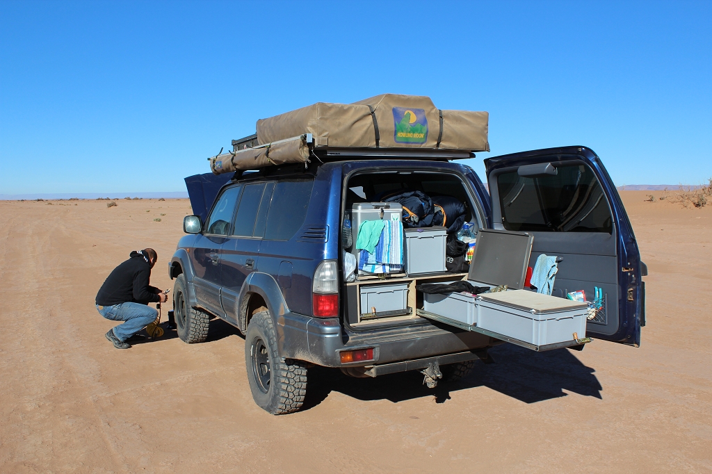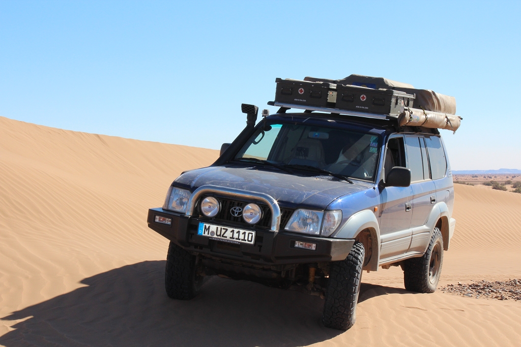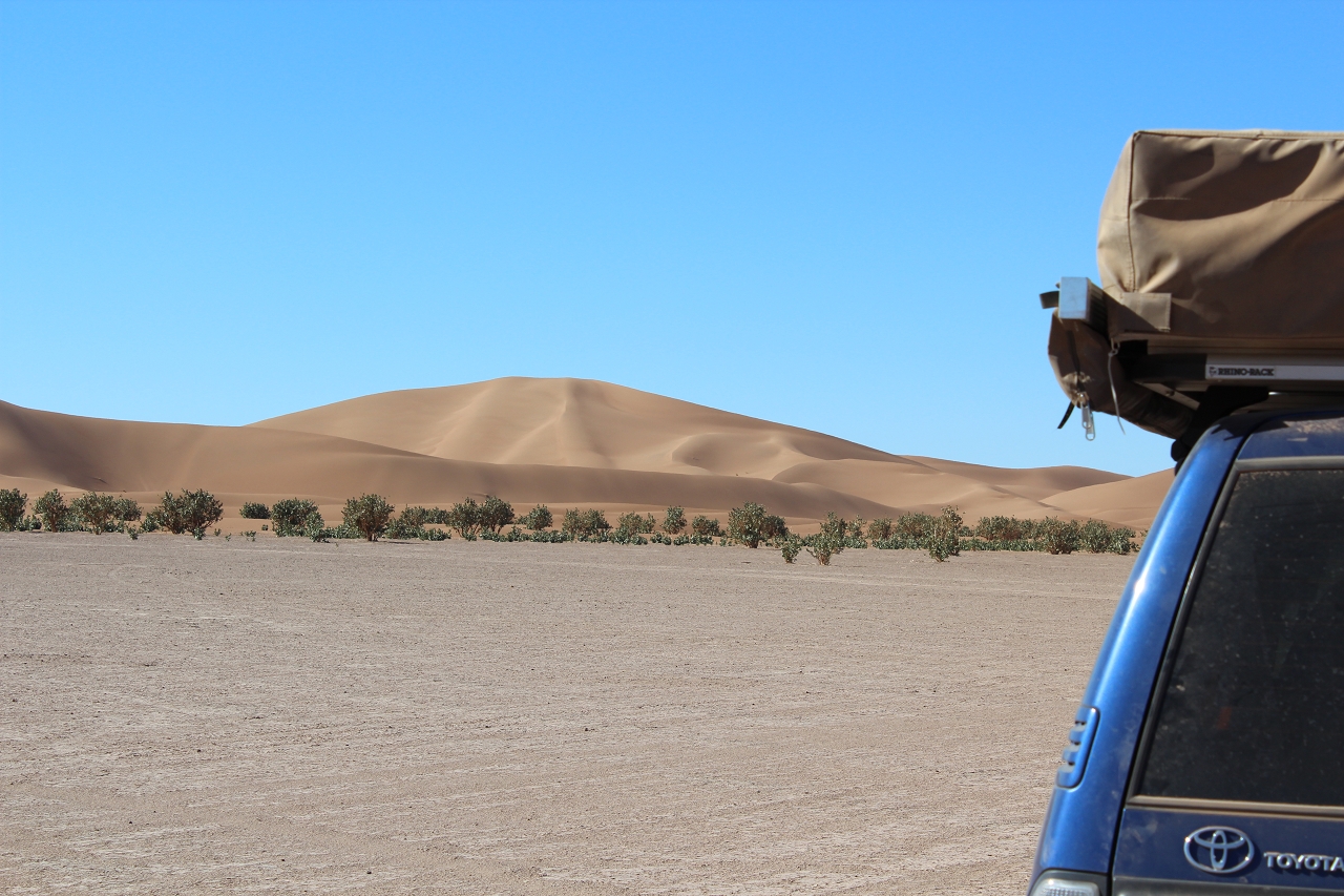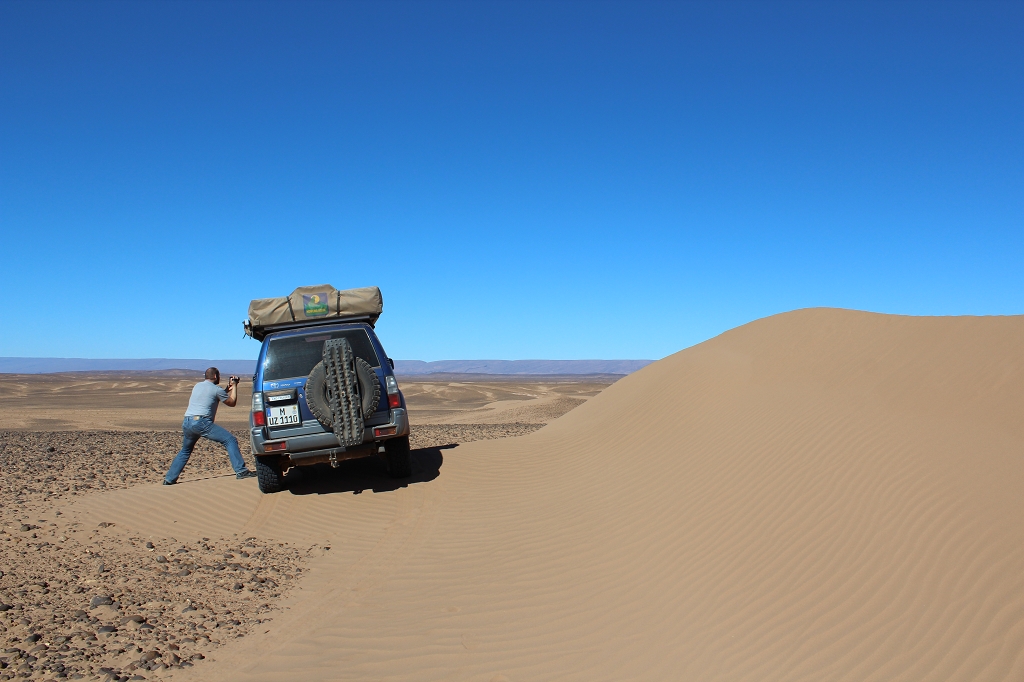 Heute Morgen sieht die Welt schon wieder ganz anders aus. Schließlich hat Tom ja heute Geburtstag. Wir haben schönstes Wetter, blauer Himmel und Sonnenschein und testen das erste Mal so richtig, wie es ist, mit MUZ im Wüstensand zu fahren.