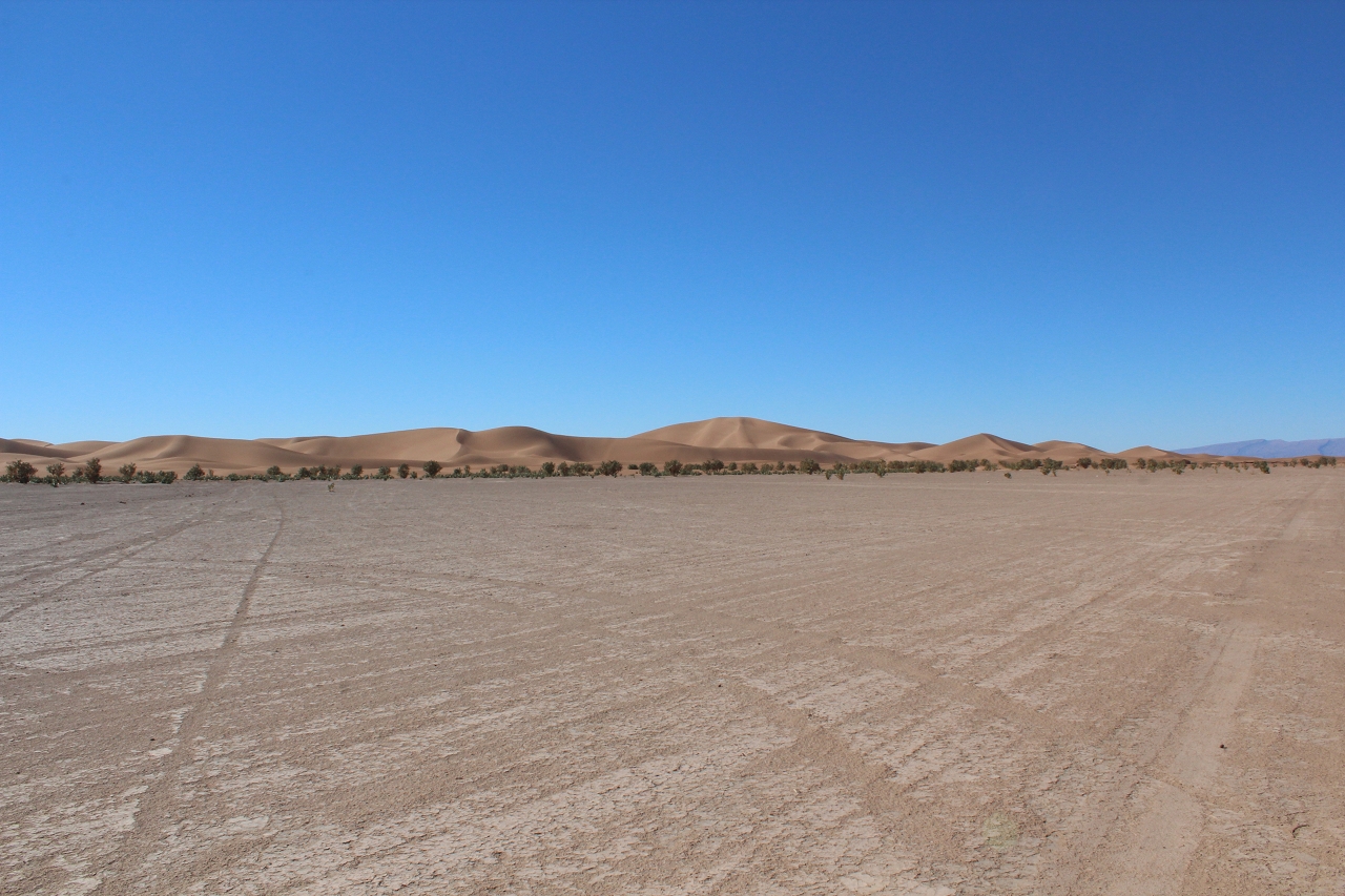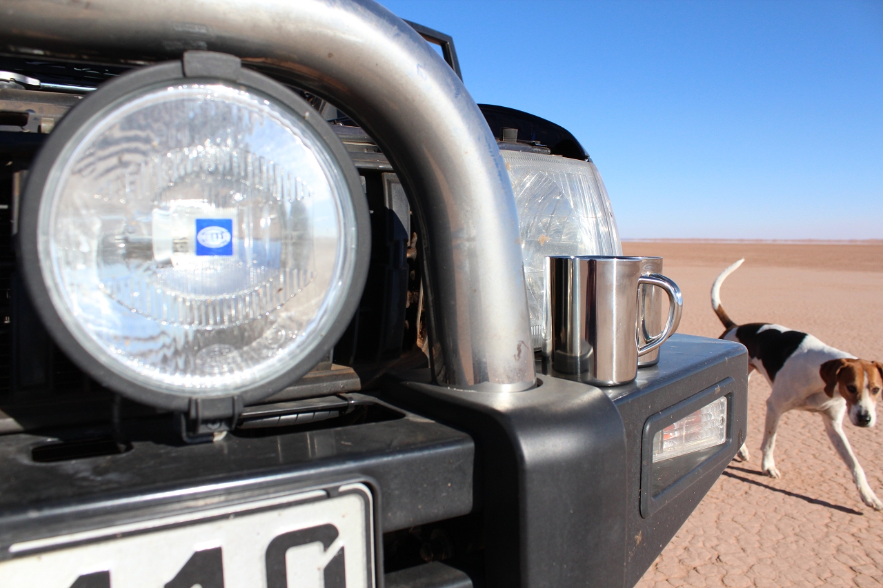 Nach klasse Pisten im Dünengebiet haben wir den Lac Iriki – einen großen ausgetrockneten Salzsee am Rande der Sanddünen – erreicht und müssen erst mal wieder unsere Reifen mit mehr Luft befüllen und natürlich einen Kaffee trinken.