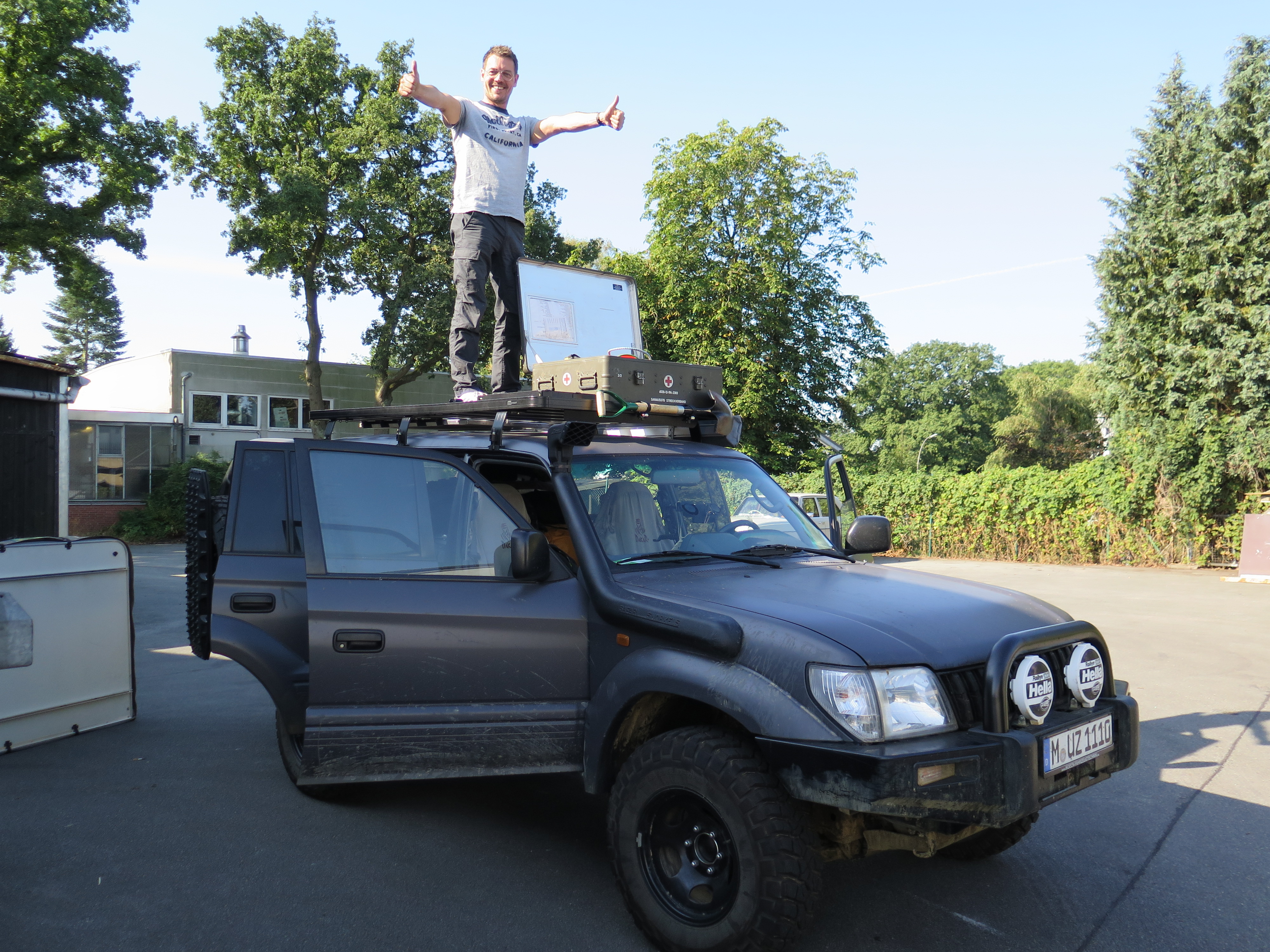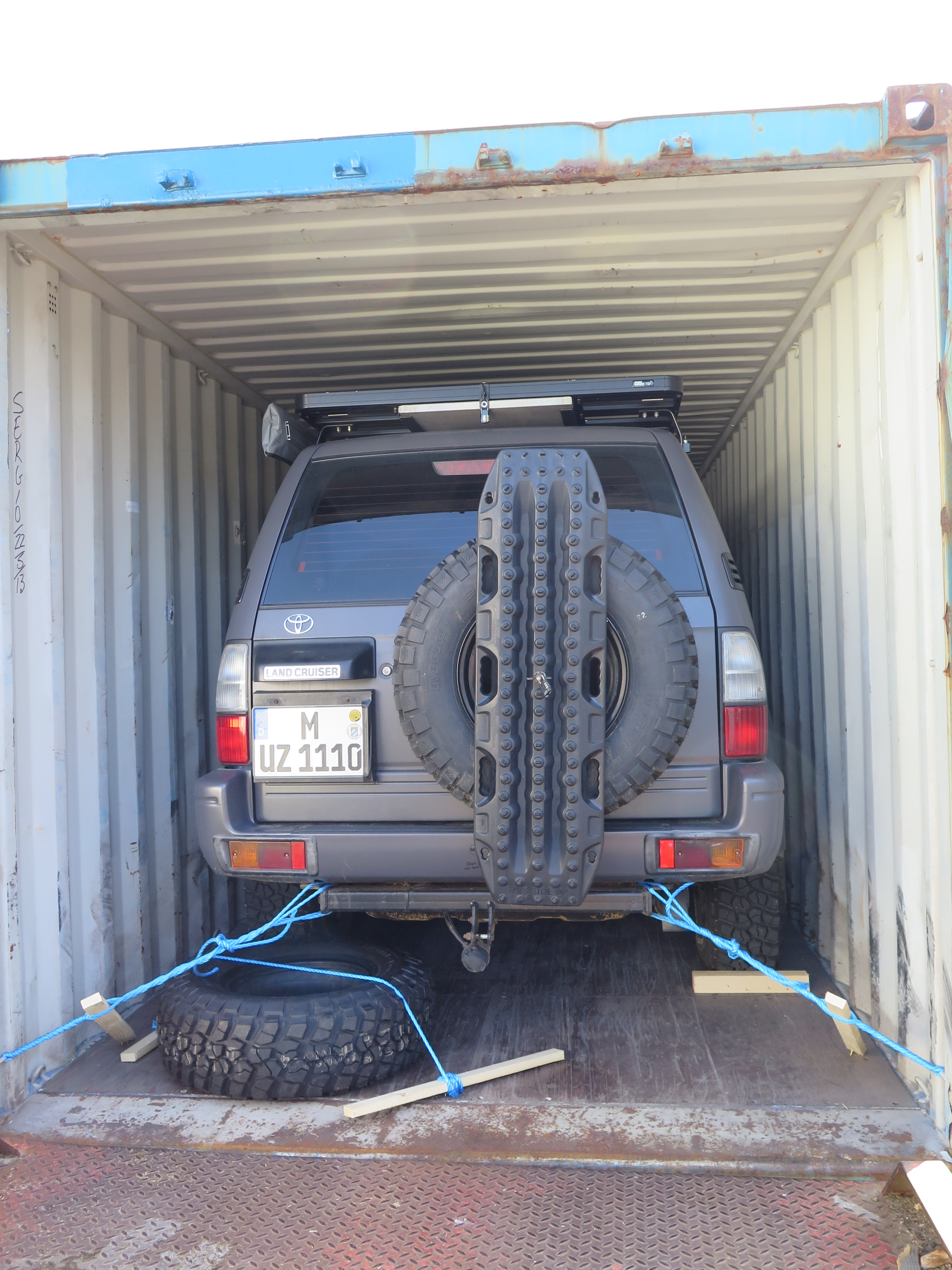 Ruck zuck montieren wir das Dachzelt, die Box und die Kanister vom Dach, schließlich haben wir darin ja schon Übung. Denn mit dem Equipment auf dem Dach ist MUZ leider zu hoch für den Container.
