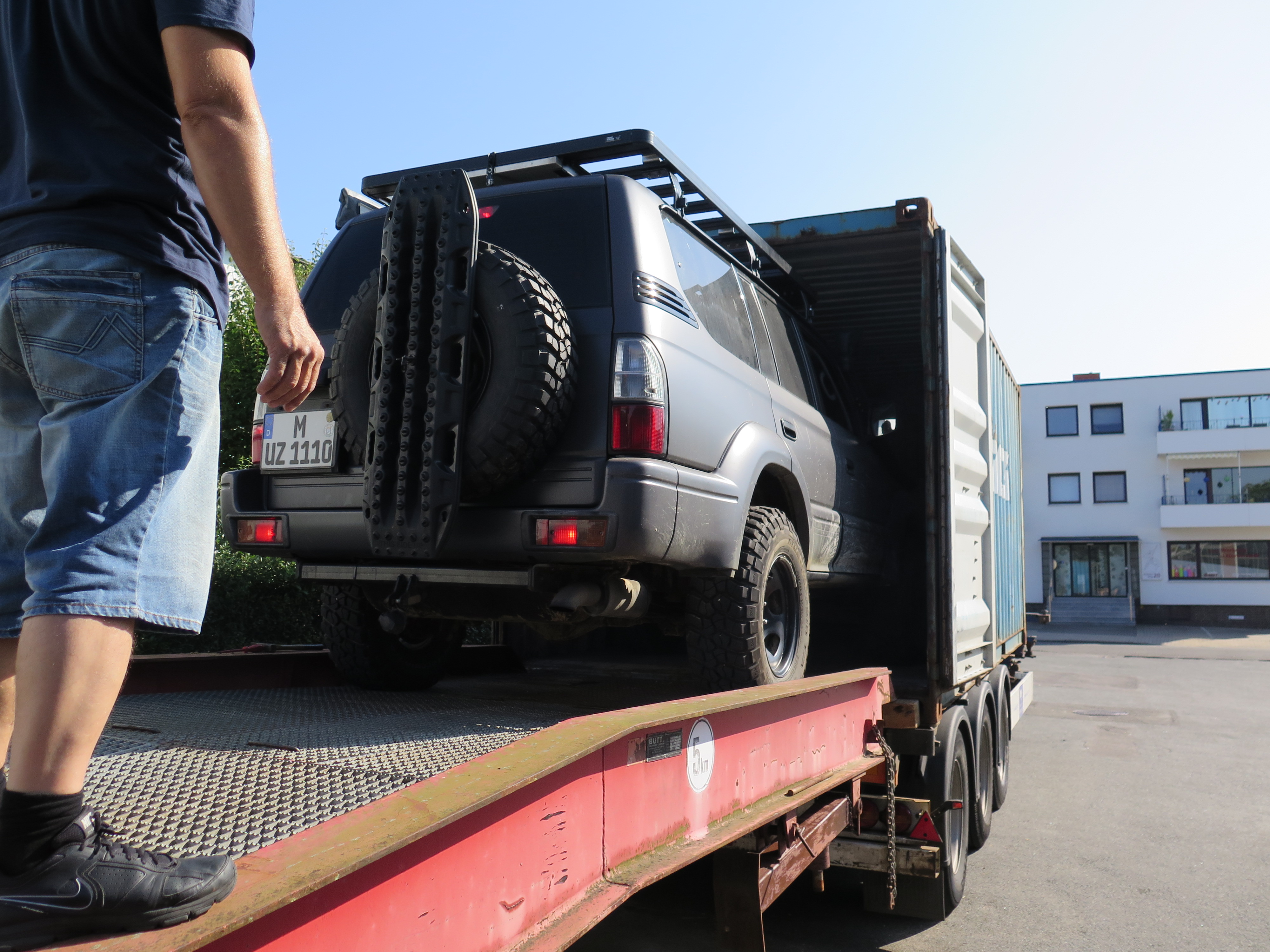 Das Dachzelt wird vorne in den Container gestellt und ehe ich mich versehen kann, fahre ich schon mit etwas wackeligen Knien auf die schmale Rampe.