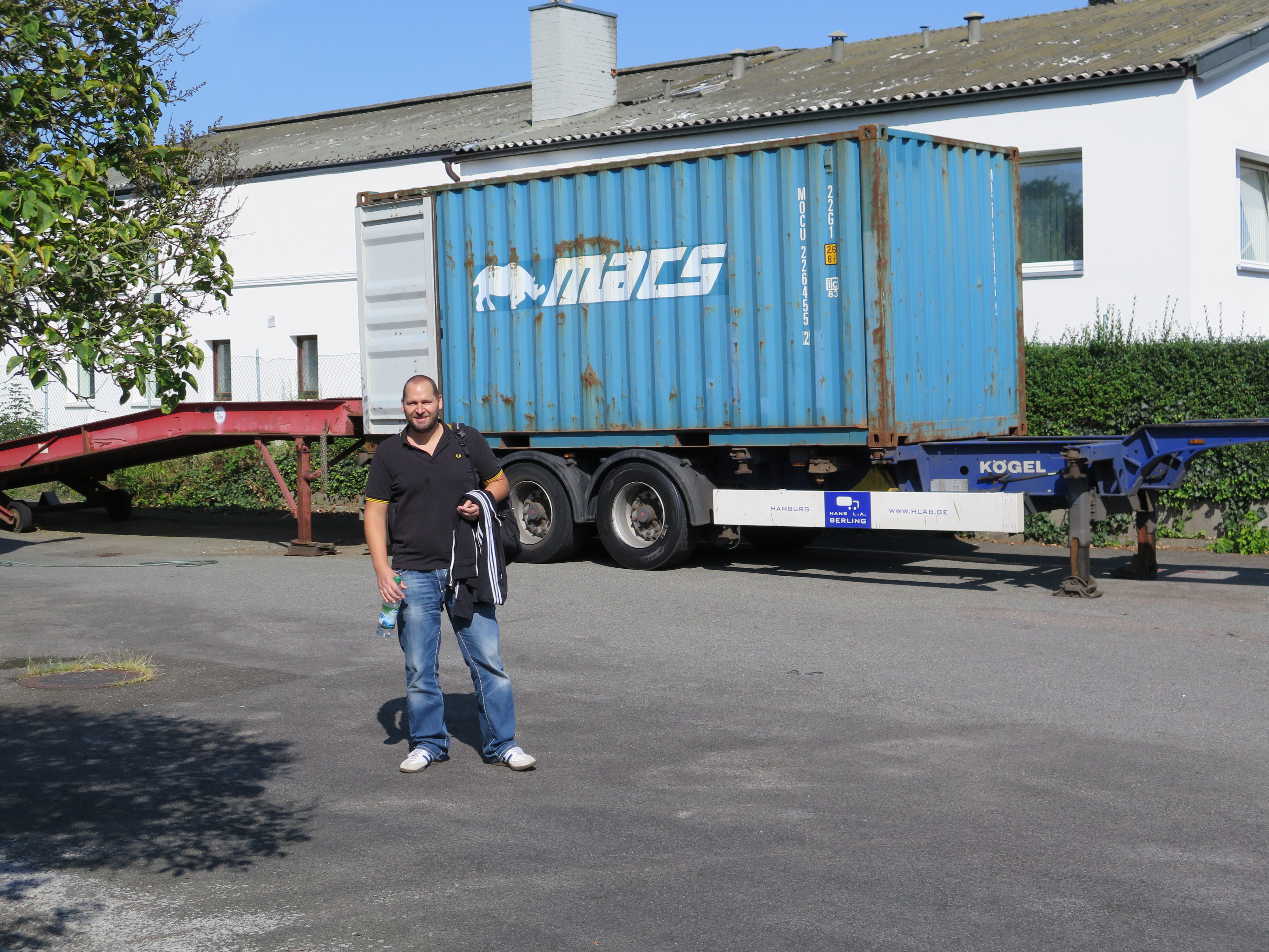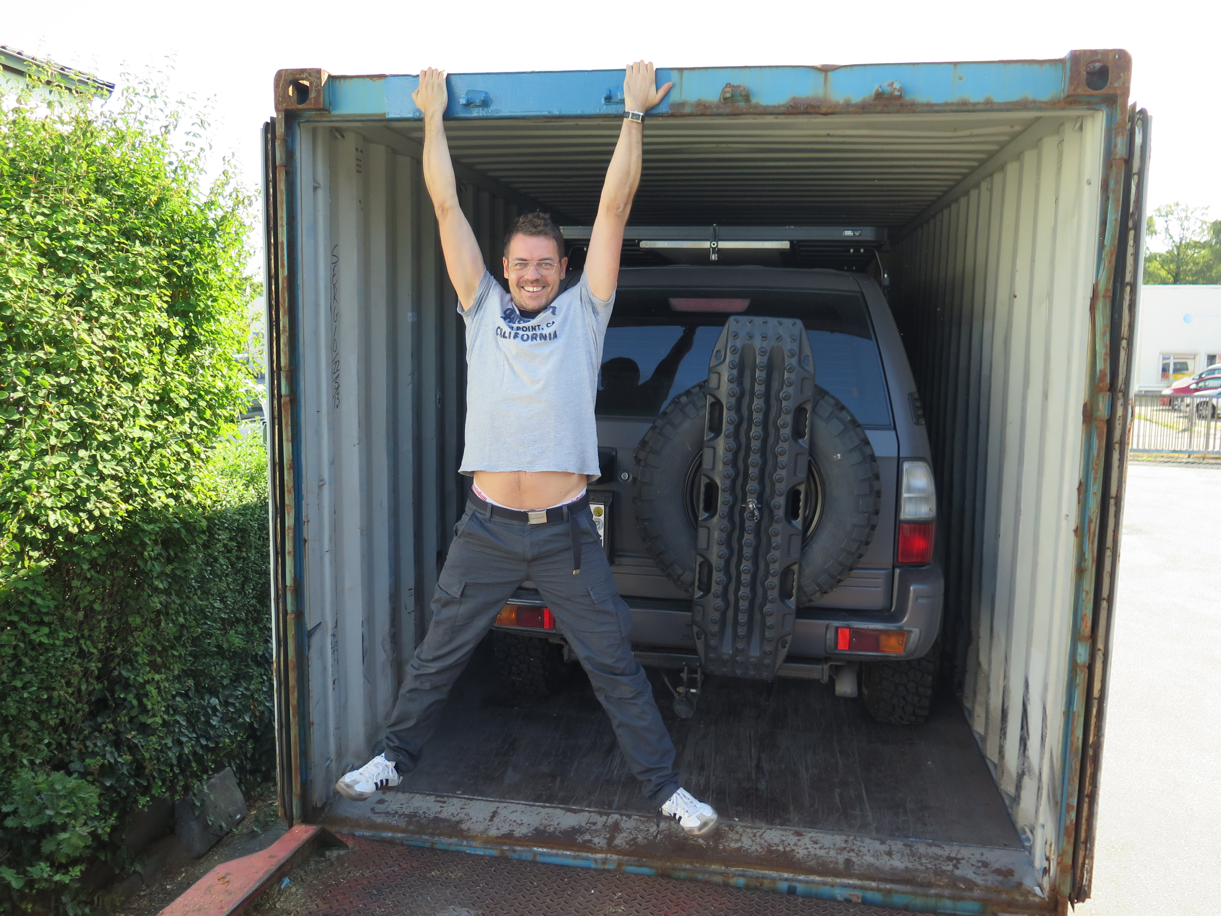 Wie gut, dass ich (trotz kleinem Bauchansatz) doch noch recht schmal bin, sonst hatte ich fast mit MUZ im Container nach Afrika reisen müssen. Aber mit kräftig Baucheinziehen schaffe ich es doch noch raus.