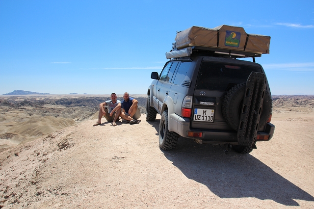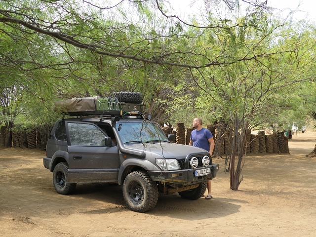 Nun noch ein paar notwendige Erledigungen. Tanken, Einkaufen im Spar, Fleisch holen bei Charlies Metzger, Wein und Bier kaufen im Bottle Store und schnell noch zum Handyshop wegen der SIM-Karten. Da dies alles doch wieder länger als erwartet dauert, beschließen wir, nicht mehr nach „Mirabib“ zu fahren, sondern nur noch Richtung „Mondlandschaft“ und bleiben auf der Campsite von Goanikontes Oasis. Hier verbringen wir die erste Nacht in unserem vertrauten Dachzelt im südlichen Afrika.
