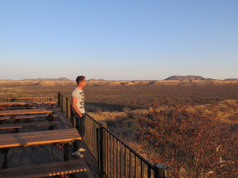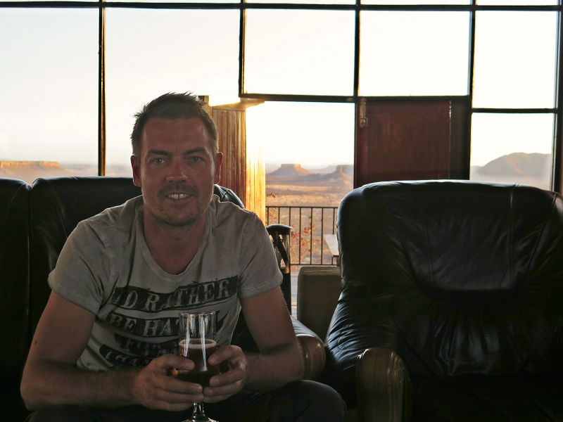 Aufgrund des Windes beschließen wir, uns einen Sundowner und das Abendessen in der Lodge hoch oben auf dem Hügel (klar, die billigen Campsites sind natürlich unten) zu genehmigen. Dort genießen wir einen sensationellen Sonnenuntergang mit Blick auf die Ugab Terrassen.