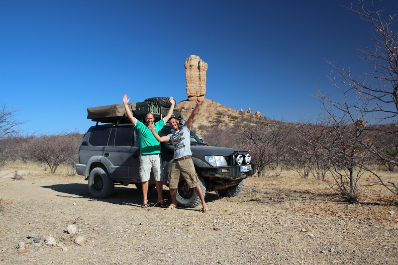 Gleich beim nächsten Tankstopp in Uis versucht Markus eine passende Schraube aufzutreiben, aber natürlich ist das mitten in der Pampa ein Ding der Unmöglichkeit. Dafür treffen wir vor einem kleinen Laden (und mehr als diesen Laden und eine Tankstelle gibt es da auch nicht) ein Ehepaar, die mit einer Bus-Reisegruppe a la Hummeldumm unterwegs sind. Als die beiden MUZ mit seinem Münchner Kennzeichen sehen, sind sie förmlich aus dem Häuschen. Die beiden sind aus München-Füstenried und das erste Mal in Afrika. Und dann treffen sie zwei Jungs mit nem Münchner Auto. Und schon sind wir mal das Fotomotiv in Afrika.