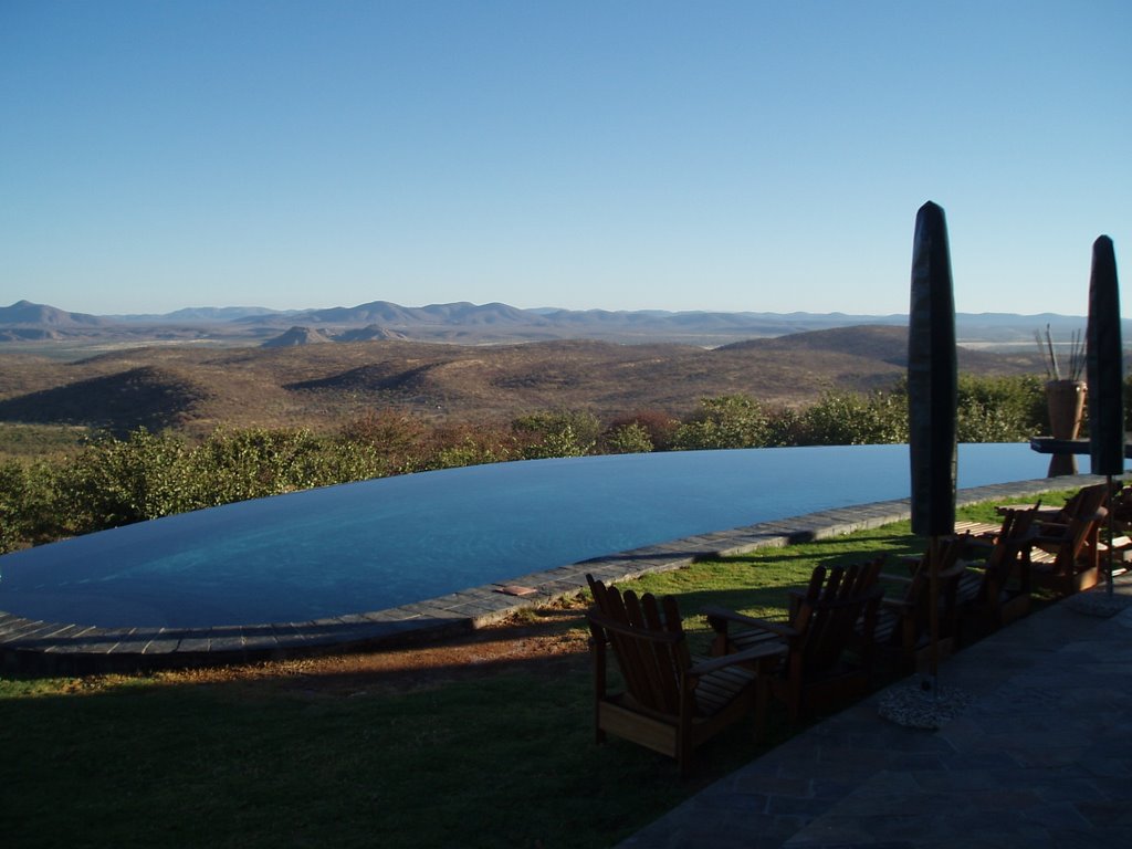 Wir fahren noch die Strecke über den steilen Joubert Pass bis nach Opuwo und bleiben dort auf der Campsite der Opuwo Country Lodge(S18 02’983“ E013 49’948“). Die Campsite ist nicht wirklich der Hit, aber für uns ist eine Dusche schon der Traum schlechthin.. Abends gehen wir noch in der Lodge Essen und genießen den Blick über den Infinitypool auf die rauhe Landschaft des Kaokofeldes.