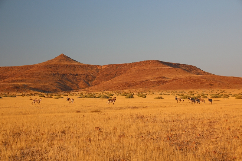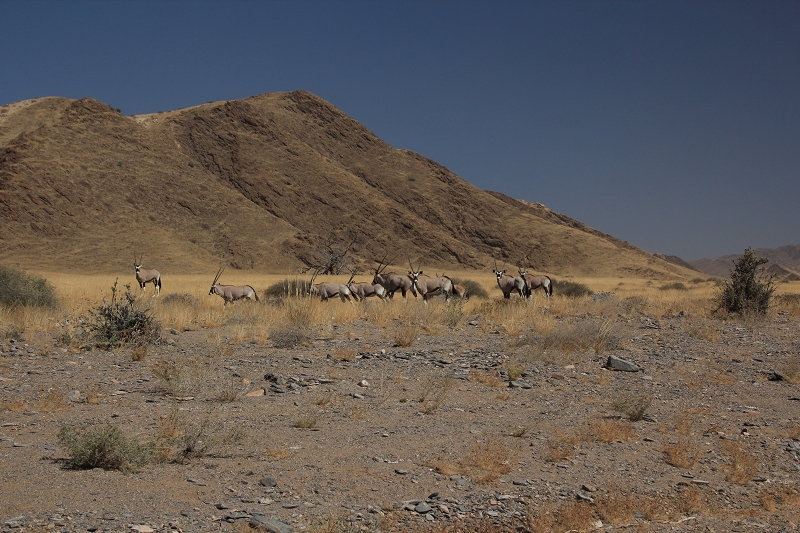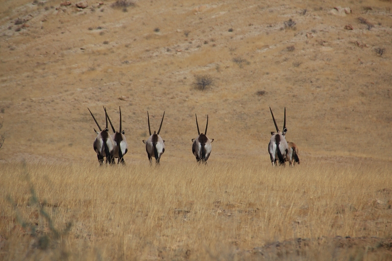 Dann bewegen wir uns erst einmal im Multi-Use-Area, ein Gebiet, das auch oft von Tagesbesuchern besucht wird. Bei einem Mittagsstopp mit Blick auf Zebras, Giraffen und Oryx-Antilopen ist es extrem heiß. Auch der Wind, der uns um die Ohren bläst, ist wie ein Fön auf heißer Stufe.