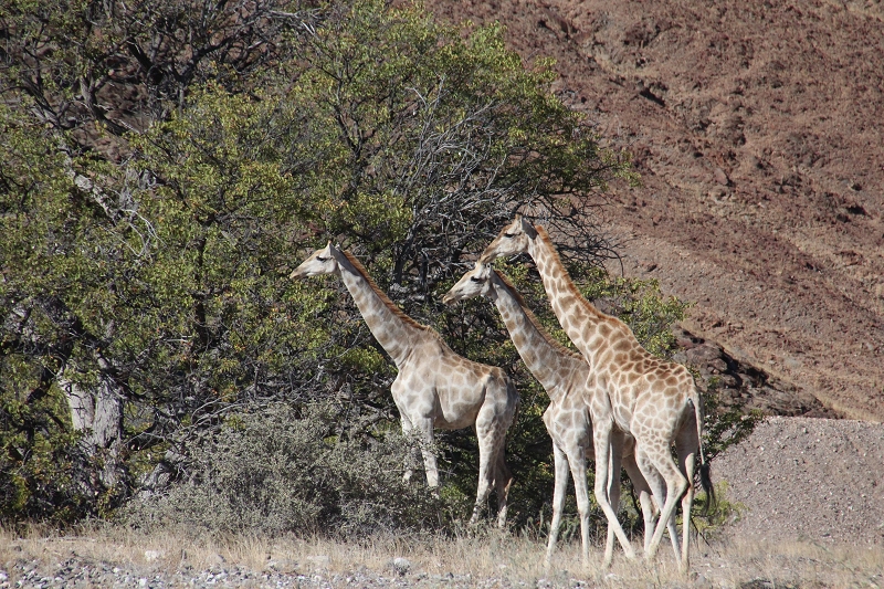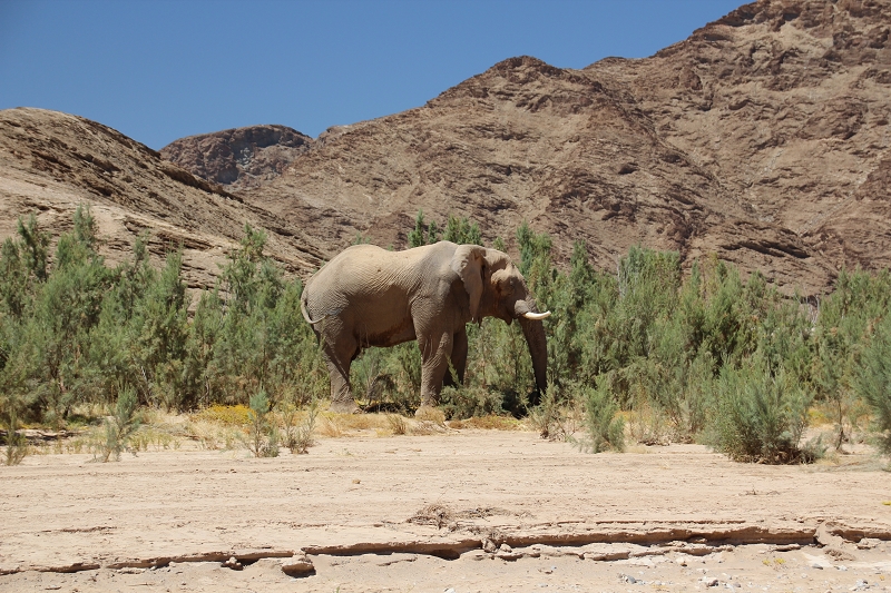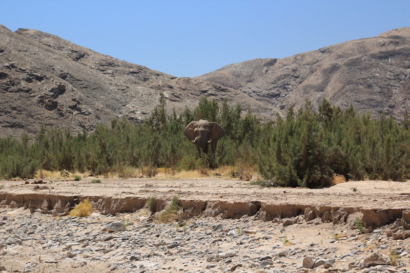 Die Strecke im Flussbett ist wirklich super schön und wir sehen viele Giraffen und Antilopen. Auf 2/3 der Strecke gibt es in der jetzigen extremen Trockenzeit auch noch einige Wasserstellen und es wird ganz grün. Und tatsächlich treffen wir wenigstens noch auf einen mächtigen Elefantenbullen beim Fressen.