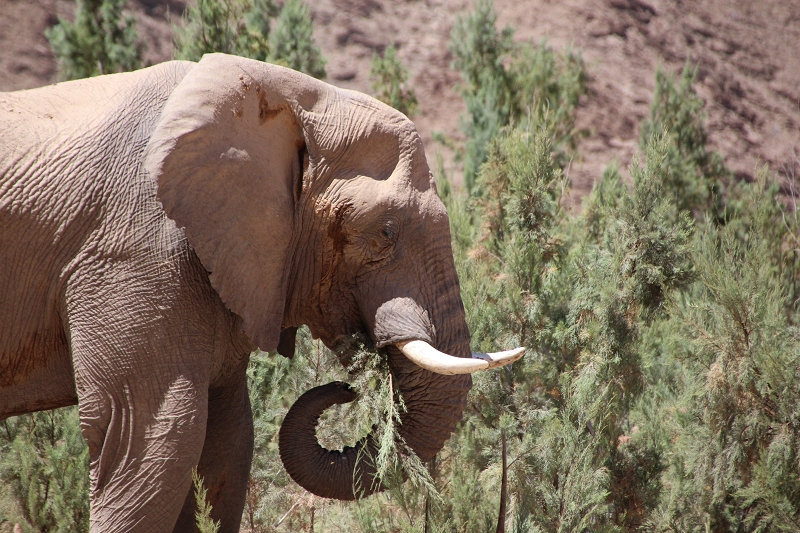 Am letzten Tag in der Palmwag Concession brechen wir um 9:00 Uhr auf. Als wir im Flussbett des Hoanib River ankommen, sehen wir Unmengen an frischen Elefantendunghaufen. Weit können sie also nicht sein.