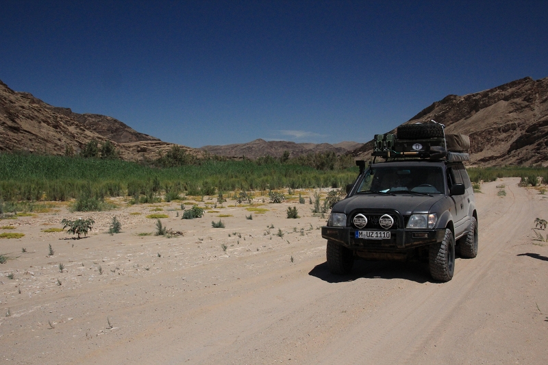 Hier ist der Moment, da haben wir gerade echt genug von Staub und Trockenheit und wir beschließen, möglichst rasch zu den Epupa Fällen zu kommen und später nochmal in die Flusstäler im Kaokofeld zu fahren.