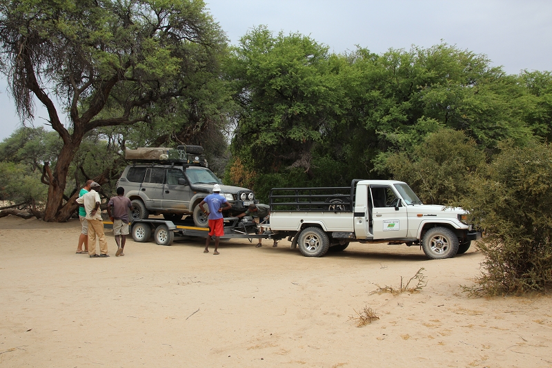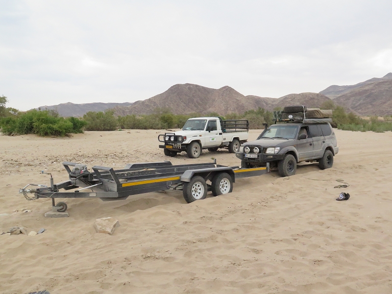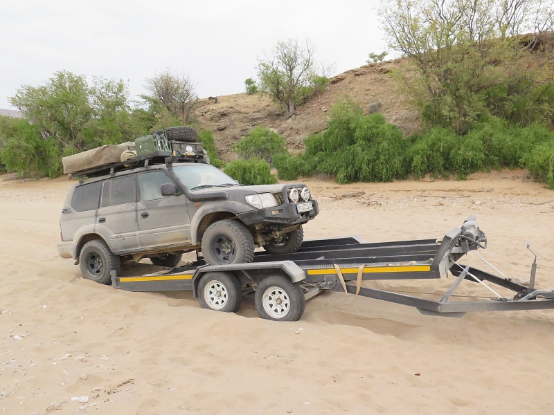 Gegen 15 Uhr kommen wir endlich los. Wir auf der Pritsche des Pick-Up (da vorne nur noch 1 Sitzplatz ist) und MUZ auf dem Anhänger. Die ersten 40 Km gehen recht gut und zügig. Wir sagen noch, super, das läuft ja ganz gut. Doch kaum ausgesprochen stecken wir plötzlich im Sand eines breiten Flussbetts fest. OK, jetzt kommen unsere Sandbleche zum Einsatz. Doch der Pickup gräbt sich nur noch weiter ein. Isaac und wir schaufeln, graben und schleppen Steine, um wieder festen Untersatz zu bekommen. Aber das alles hilft nix. Wir sind definitiv zu schwer und MUZ muss runter vom Anhänger. Nach weiterem anstrengendem Buddeln schafft es Isaac endlich, mit dem Pickup und dem Anhänger hier loszukommen und fährt erst mal ca. 100 Meter ans andere Ende des Flussbetts. Ohne Anhänger kommt er wieder zurück und zieht nun unseren MUZ dort raus.