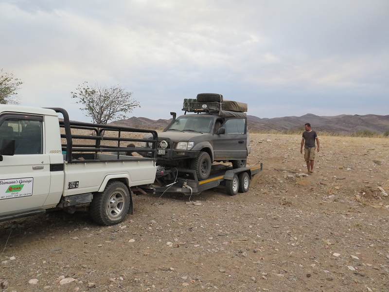 Endlich ist Montag und wir warten ungeduldig auf die Hilfe. Peter von der Weimann`s – Garage ruft uns kurz an und teilt uns mit, dass der Fahrer bereits um 4 Uhr morgens in Outjo losgefahren ist. Somit sollte er gegen 14 Uhr bei uns sein, da er laut Peter um 10 Uhr in Sesfontein war und für diese Offroadpiste braucht man ca. 4 Stunden.