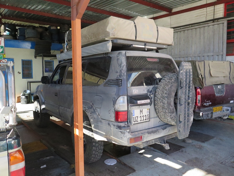 Pünktlich um 8 Uhr am nächsten Morgen schlagen wir beim „Gear Box & Diff Doctor“ auf. Kurzer Check, oh je, immer noch Wasser im Getriebe. Aber Anton meint, vielleicht noch 2-3 mal spülen und dann sollte gut sein. Währenddessen die das machen, bringt uns einer in die größte Shopping Mall, die Windhoek zu bieten hat. Wir vertreiben uns die Stunden mit Cafetrinken, Blog schreiben und Flanieren. Am frühen Nachmittag sind wir wieder zurück. MUZ hat jetzt auch noch einen zusätzlichen Kühler für das Automatikgetriebeöl bekommen. Somit kann uns so ein Scheiß, dass sich das Wasser vom Kühler mit dem Öl vermischt nicht mehr passieren. Selbst wenn wieder so ein Verbindungsstück vom Kühler rausbrechen sollte. Apropos, auch Koos und Anton bestätigten uns, dass da schon mal rumgemacht wurde. In diesem Sinne, viele Grüße an den Vorbesitzer vom MUZ bzw. dessen Werkstatt!