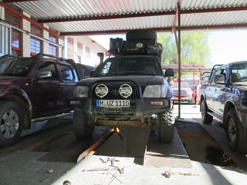 kIMG_0029Der Chefmechaniker inspiziert gleich den MUZ und möchte von uns nochmal genau wissen, was wie passiert ist. Er meint auch, dass wir einen neuen Kühler brauchen und verschwindet erst mal wieder im Büro. Nach einer Weile kommt er wieder und meint, dass dieser Kühler erst wieder zum 22. Dezember 2014 zu bekommen ist. WIE BITTE??? Ja, wir haben schon richtig gehört. Er hat es über Toyota Namibia und Südafrika überprüfen lassen. Also keine Chance, da wir ja einen Importwagen, sprich einen links gesteuerten haben. Das darf doch alles nicht wahr sein. Von jetzt ab wird bei uns beiden der Frust immer größer.