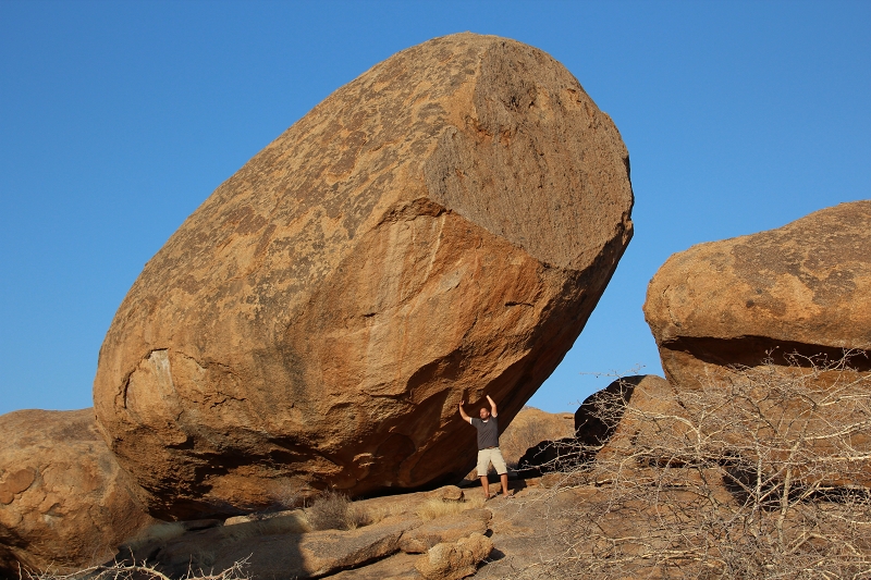 Zuerst fahren wir zu einem Felsen, der mit einiger Phantasie aussieht wie ein riesiger Elefantenkopf, daher auch Elephanthead-Rock. Gleich daneben das Gelände der sogenannten „Bulls Party“. Schon verrückt, wie hier irgendwann die riesigen Felskugeln zum Liegen kamen. Zum Teil hat man das Gefühl, die Kugeln hängen nur an einem ganz dünnen Stück am Felsen fest und würden jeden Moment loskugeln und einen platt walzen. Bei Markus´ “Glück“ wäre das ja kein Wunder. Tom sagt immer….. „verschrei´s ned, sonst passiert es noch“.
