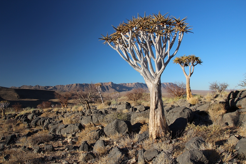 Am späten Nachmittag starten wir unsere Tour mit Christine. Sie erklärt uns auf dem Weg zum Köcherbaumwald immer wieder verschiedene Pflanzen auf dem Farmgelände. Eine wirklich interessante Fahrt auf ihrem Pickup. Der Höhepunkt der Fahrt ist natürlich der Wald aus unzähligen Köcherbäumen. Beim tollen Abendlicht eine klasse Fotostimmung.