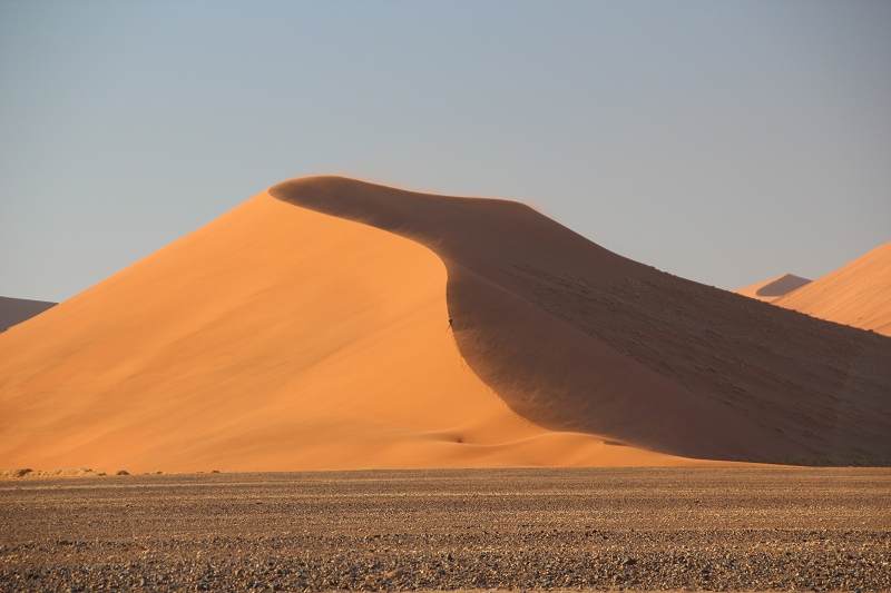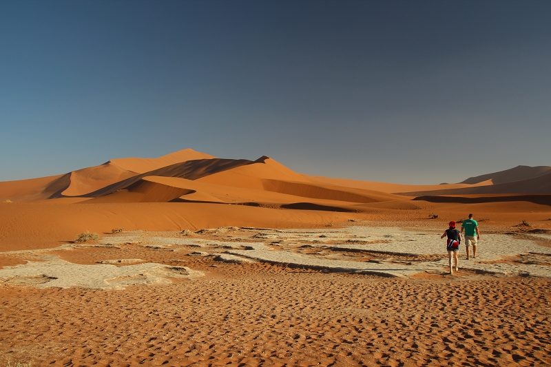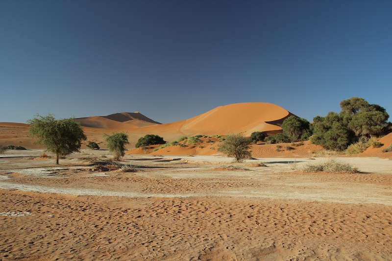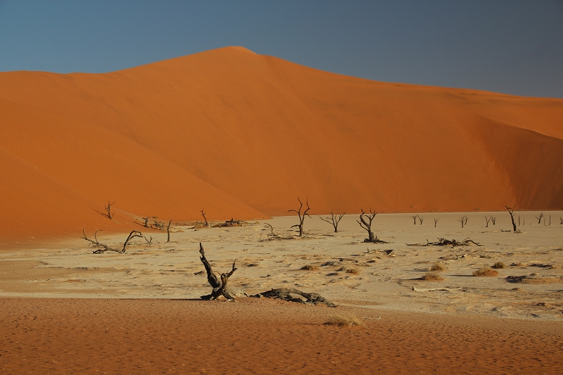 Zu unserer Überraschung sind wir ganz alleine hinten am Sossousvlei. Aber die „klassischen“ Touris haben das Programm natürlich schon morgens absolviert. Somit können wir gemütlich unseren Kaffee trinken und die Stimmung dort genießen. Andrea krabbelt noch sportlich auf die Dünen. Die Zeit vergeht dann doch so schnell, dass wir noch mit ordentlichen Schritten den Weg ins Dead Vlei absolvieren. Schließlich wollen wir ja noch das schöne Licht ausnutzen und der Weg zurück zum Gate zieht sich dann mit ca. 60 km ja doch noch.