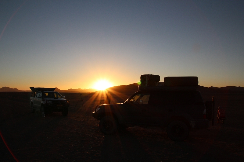 Somit sind wir alle ziemlich gerädert als wir um 5:00 Uhr morgens aufstehen. Aber wir wollen schließlich auch den Sonnenaufgang in den Dünen erleben – und es ist auch immer wieder ein tolles Erlebnis.