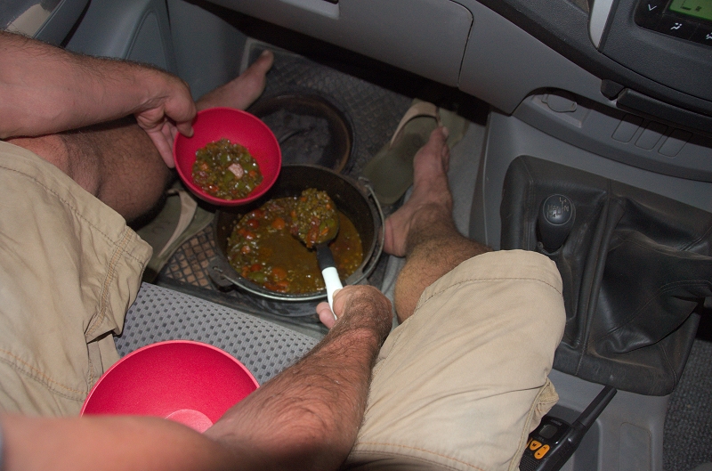 Es gelingt uns gerade noch, den heißen Potje auf die Ladeluke von Andreas Karre zu stellen und mit unseren Weingläsern ins Auto zu springen, da fängt es in Strömen an zu schütten, begleitet von ordentlich Wind, Blitz und Donner.