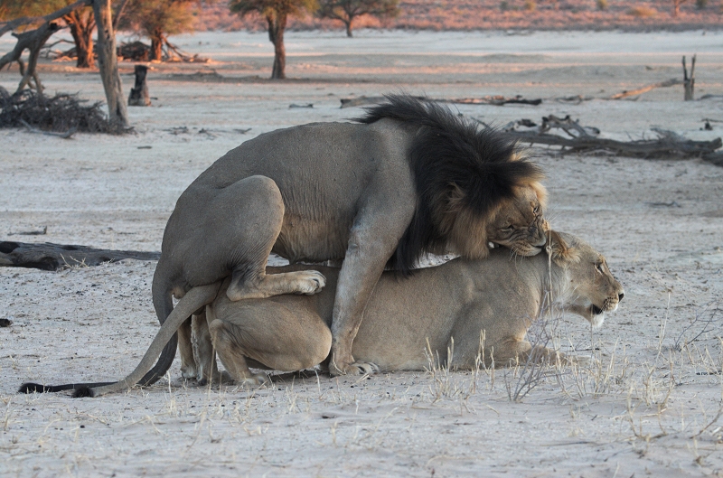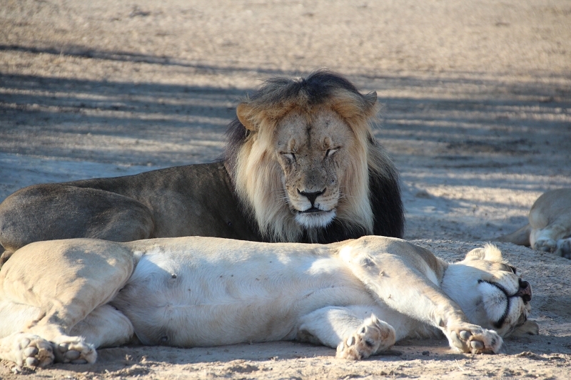 In Nossob versuchen wir am Abend nochmal unser Glück bei einem Game Drive und freuen uns sehr, dass wir nochmal ein prächtiges Löwenmännchen mit einer hübschen Lady an seiner Seite treffen.