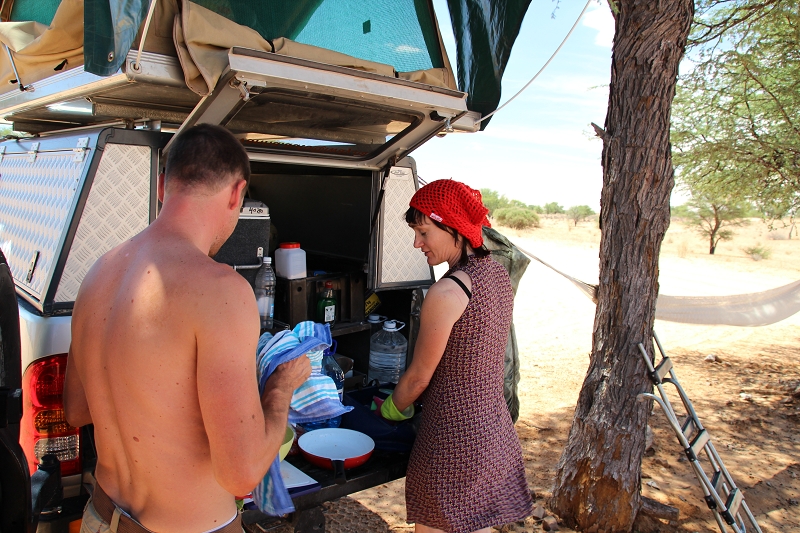 Den nächsten Tag verbringen wir nach einem wenig ergiebigen Game Drive gammelnd auf der Campsite. Es tut ja auch immer wieder mal gut, einfach faul in der Hängematte oder im Dachzelt zu liegen oder trotz Wind leckere Pan-Cakes und Brot zu backen. Mittlerweile sind wir ja echt schon abgehärtet, was den Wind auf unserer Reise angeht.