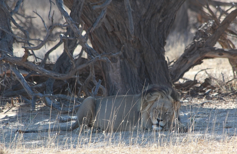 Auf unserem Weg Richtung Nossob, das zweite Main Camp mit Einkauf- und Tankmöglichkeit im Park, treffen wir auch endlich neben einigen Antilopen auf die ersten Großkatzen. Zuerst ein hübscher, aber faul im Schatten liegender Löwe und kurz darauf noch Geparden.