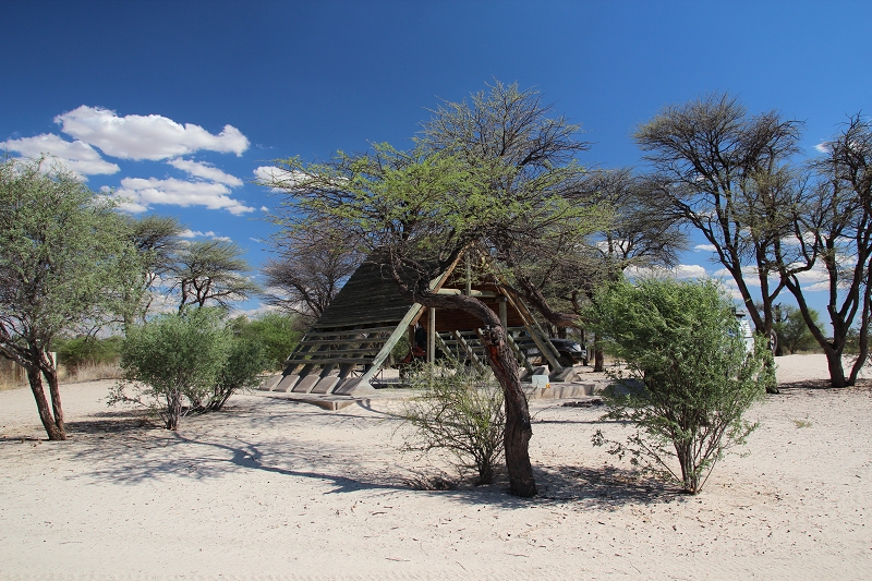 Die Campsites auf der Botswana Seite des Parks sind sehr spartanisch eingerichtet, aber immerhin gibt es ein schönes A-Frame Sonnendach und eine Buschtoilette sowie eine Vorrichtung zum Aufhängen der Dusche. Bei den Temperaturen ist unsere Solardusche ach schnell einsatzbereit.