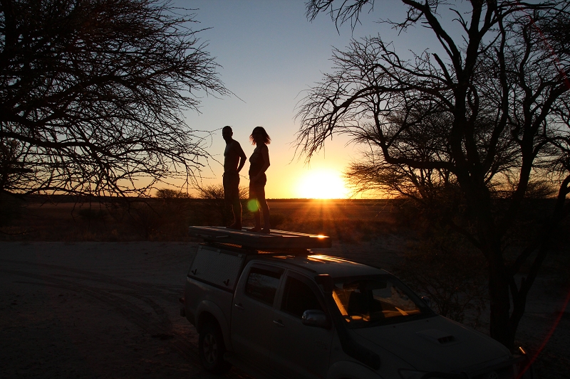 Nach einem erneut wenig tierreichen Game Drive am Abend überlegen wir bei einem wunderschönen Sonnenuntergang und einem tollen Blick über die Pan, ob wir unsere Tour im Kgalagadi frühzeitig beenden sollen oder ob wir doch noch den Weg und die 6 Tage in der abgelegenen Mabuasehube Region auf uns nehmen sollen?