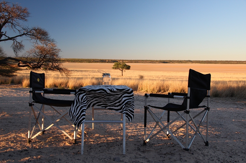 Am späten Nachmittag fahren für zur Mabuasehube Pan rüber und lassen uns dort nieder. Zum Sundowner hören wir erneut Löwengebrüll ganz in der Nähe der Pan und wir bekommen Besuch von einem ziemlich frechen Schakal.