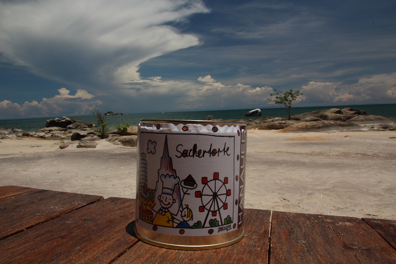 Nach dem Frühstück schauen wir noch bei Julie und Peter vorbei, da sie heute weiterziehen möchten. Wir tauschen Kontaktdaten aus, studieren gemeinsam die Landkarte und plötzlich kommt Julie mit einer Dose aus ihrem Buschtaxi. Man glaubt es kaum. Eine original Wiener Sachertorte aus der Dose für Tom. Eine tolle Überraschung, bei sowas strahlt Tom natürlich über beide Ohren. Danke, Julie und Peter!