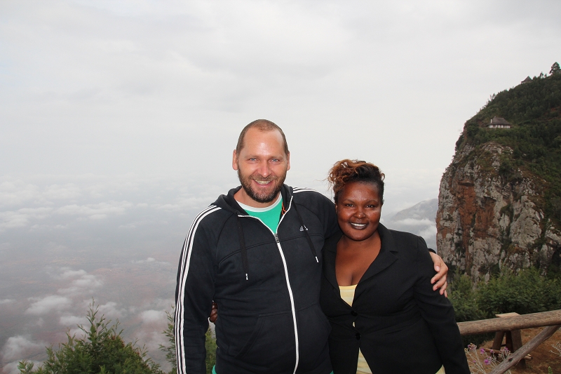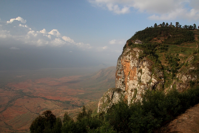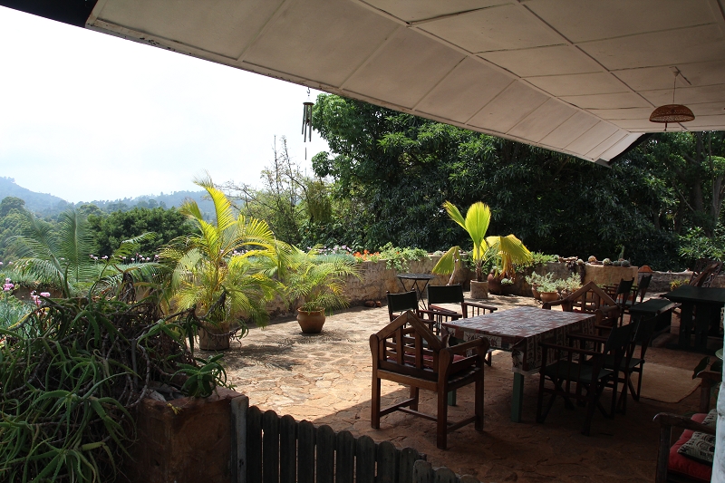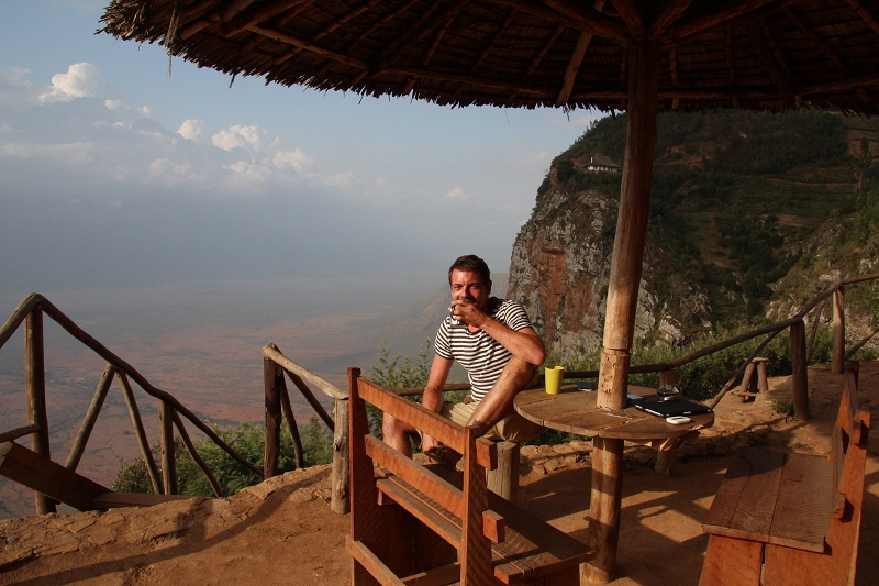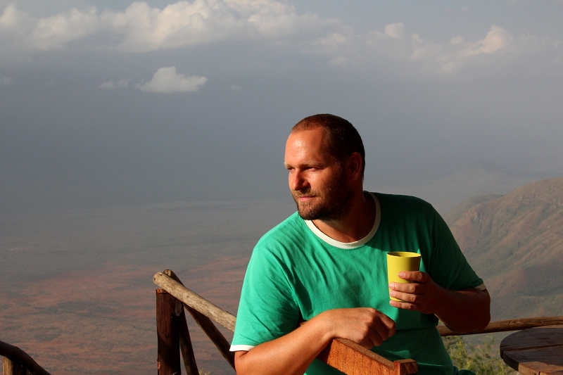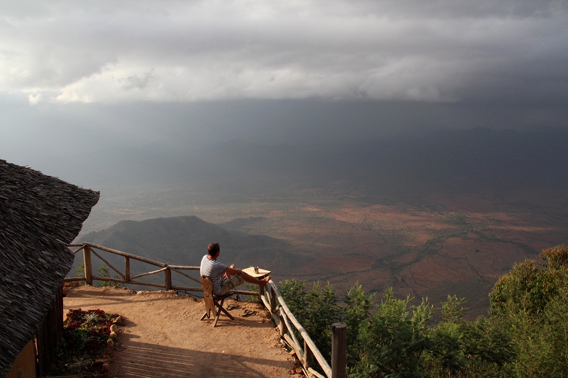 Bei unserer Unterkunft, Mambo Inn, angekommen, sind wir von dem sensationellen Blick echt angetan. Es ist zwar leider etwas diesig, aber man sieht dennoch die weite Masai-Ebene tief unten im Tal. Schade, dass es so wolkig ist, denn bei klarer Sicht würde man sogar den Kilimanjaro sehen können.